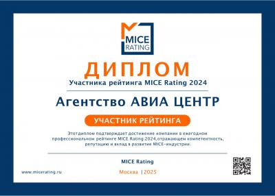 Агентство АВИА ЦЕНТР вошло в топ участников ежегодного рейтинга MICE-услуг и заняло 9-е место в рейтинге 2024 года. Рейтинг составлен сообществом MICE backstage на основе официальных данных государственной бухгалтерской (финансовой) отчетности.