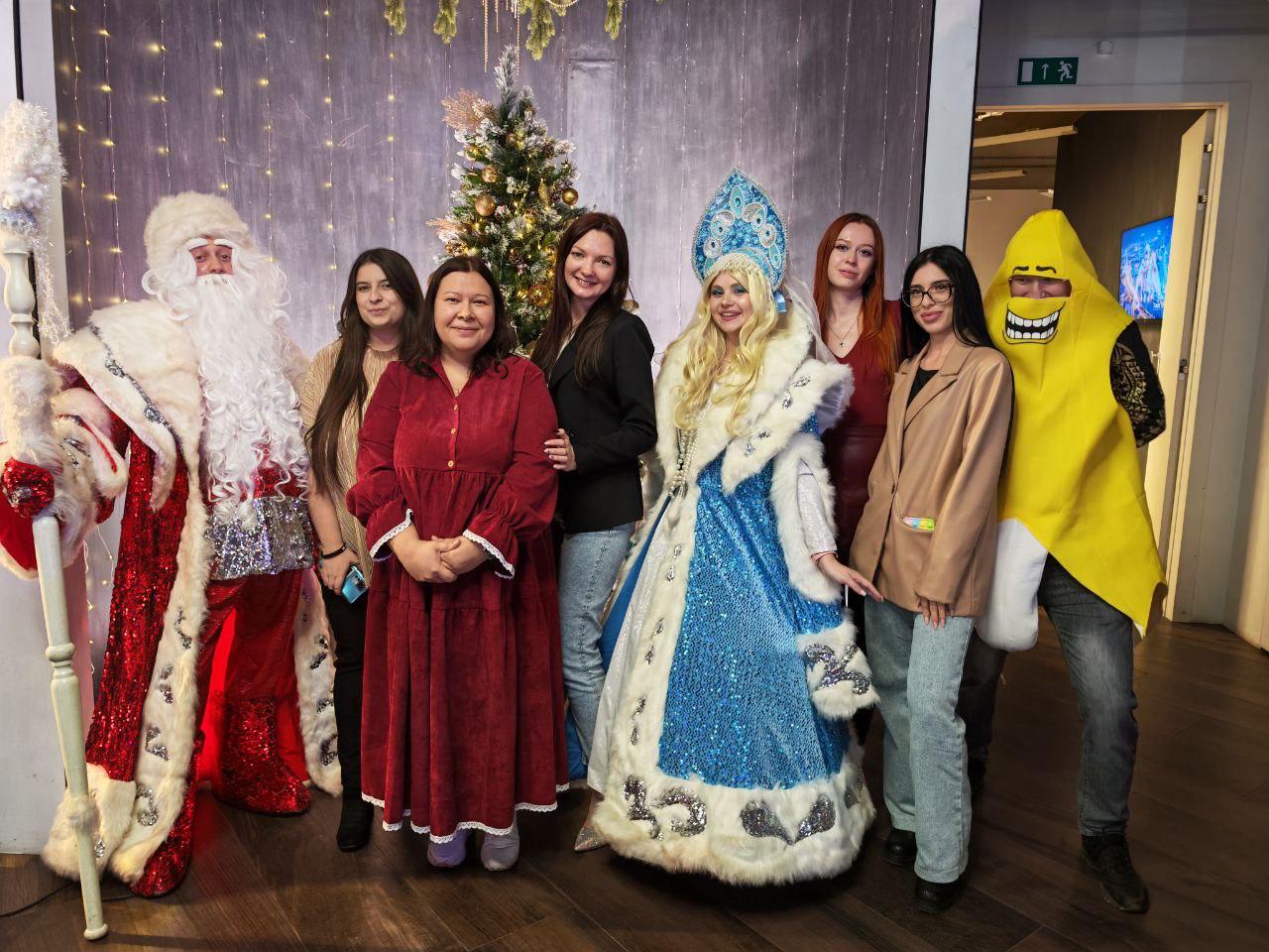 - Персонажи. Дед Мороз и Снегурочка отвечали за каноничную атмосферу, но и тут не обошлось без юмора — фотосессия с коллегой в костюме огромного банана определенно стала хитом внутренних чатов.