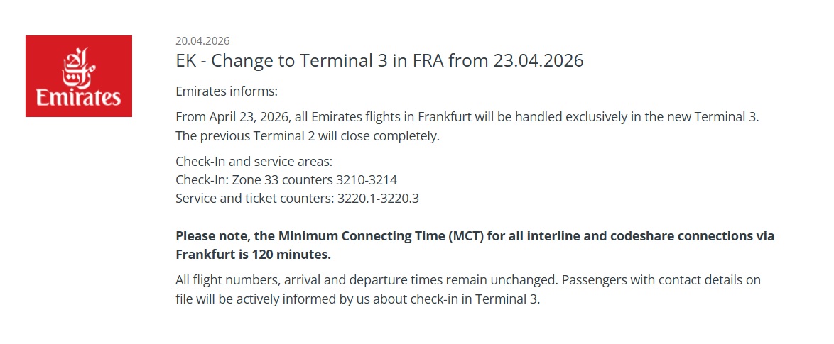 С 23 апреля 2026 все рейсы Emirates во Франкфурте будут обслуживаться исключительно в Терминале 3.